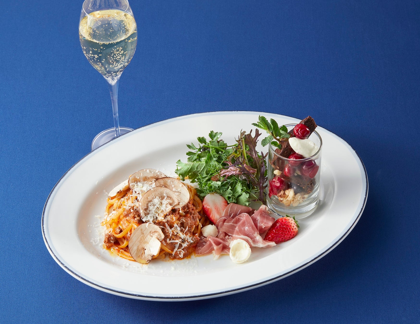 (国産牛挽き肉のトマト煮込み赤ワインソースパスタ/生ハムと季節の果実/ハーブサラダ/デザート/スパークリングワイン)