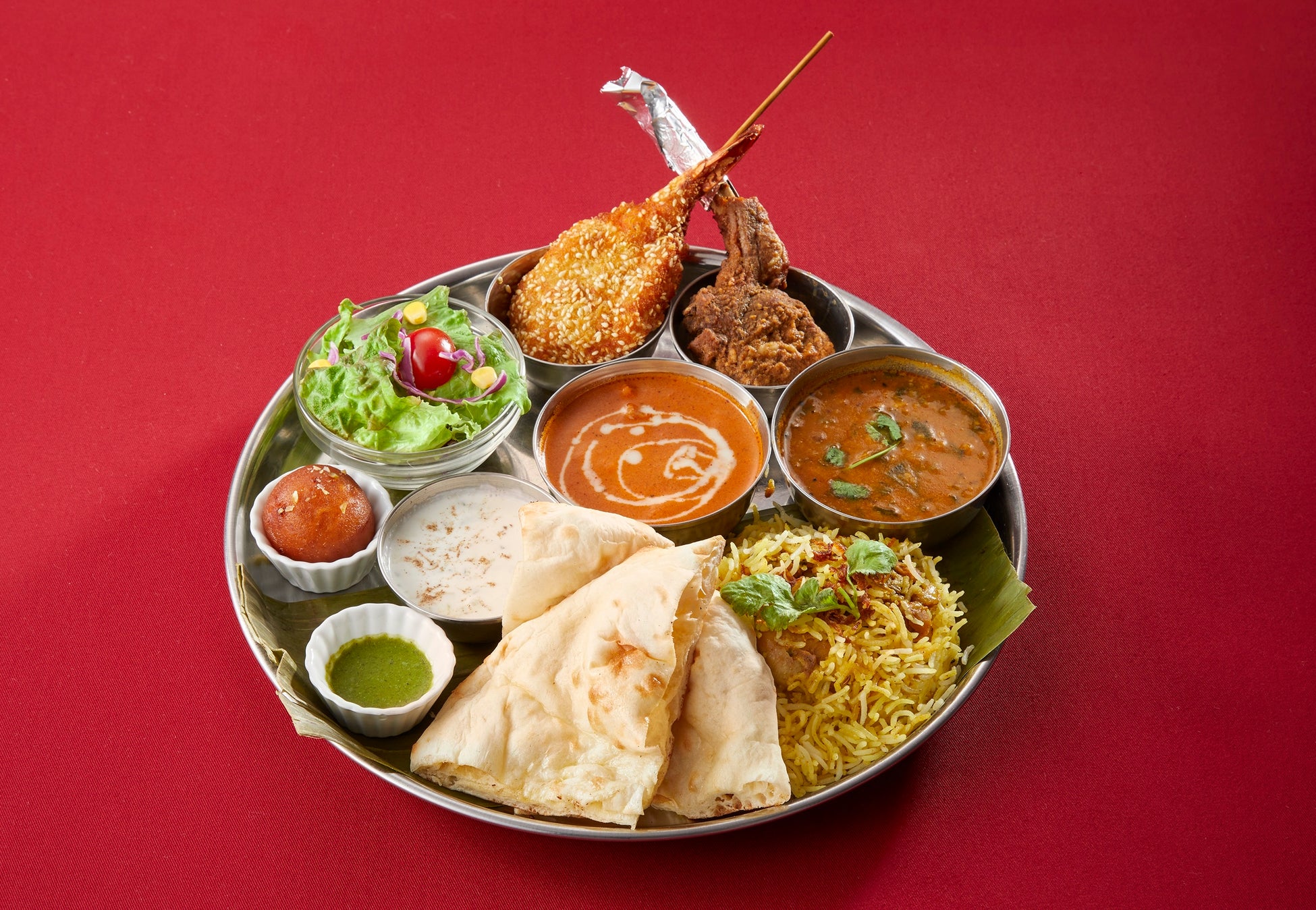 (バターチキンカレー/ダルパラックカレー/インドのご馳走チキンビリヤニ/ラムチョップ/セサミプロン(海老のゴマ串揚げ)/ライタ(ヨーグルトサラダ)/ナン/サラダ/ミタイ)
