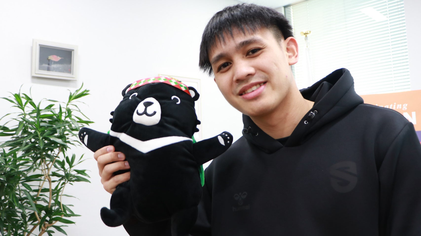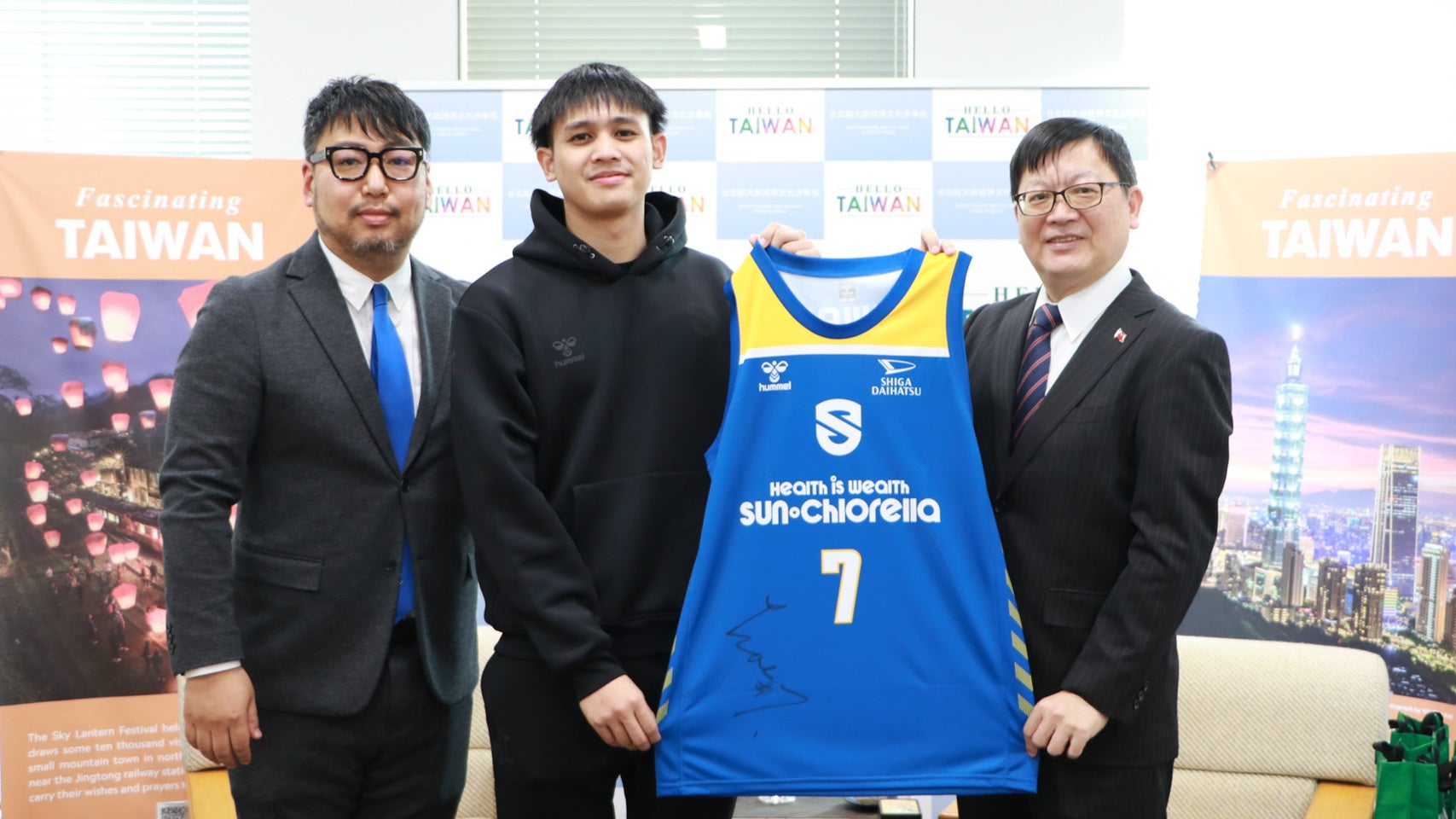 洪総領事から滋賀での生活や食事などについても尋ねられましたが、游選手も楽しみながら異国でのプロ生活を送れていることを報告。懇談の最後には持参したユニフォームにサインを入れてプレゼントしました。