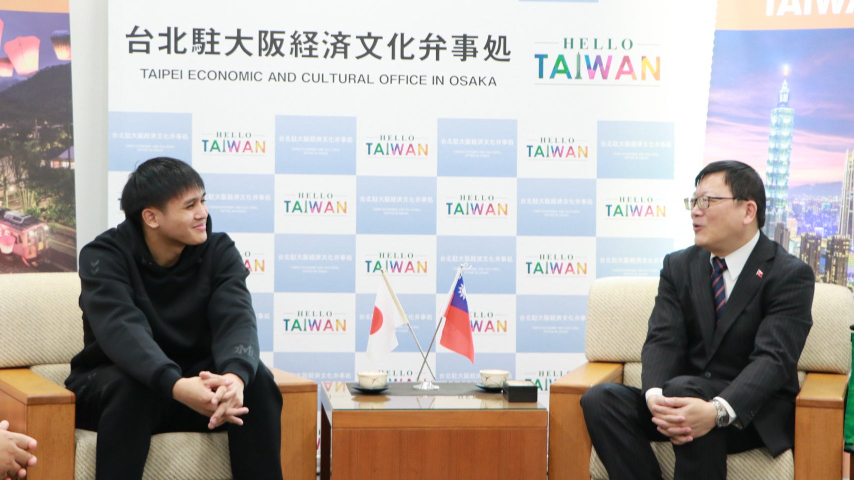 游艾喆選手が1月22日、大阪市にある台北駐大阪経済文化弁事処を中山太代表取締役会長とともに表敬訪問し、洪英傑総領事と懇談しました。