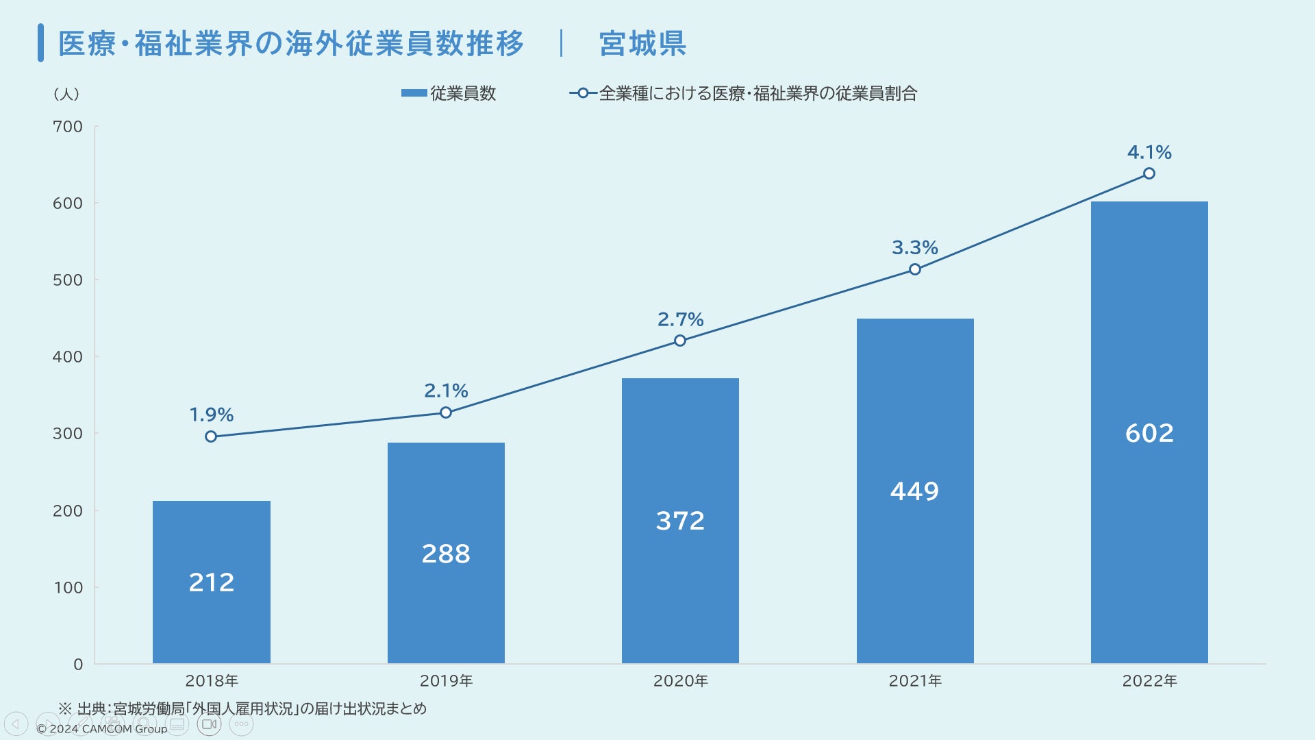 このセミナーは、宮城県の介護業界で人材不足が顕著であり、外国人材の労働力の必要性が一層増していることを背景に、就業する外国人材と受け入れる企業の双方にとって働きやすい環境を実現することを目的として開催されました。