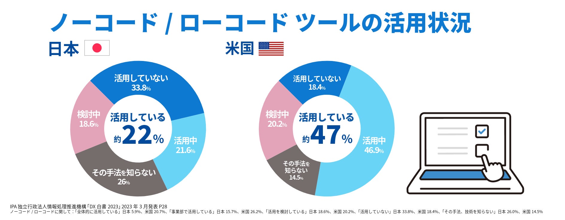 プログラミングを行うことができるエンジニアを育成するには、多くの時間とコストがかかります。しかし、プログラミングの知識がなくても、ドラッグ&ドロップなどの直感的な操作でアプリを開発できる「ノーコードツール」を活用すれば、未経験者でも短期間の研修でアプリ開発が可能になります。さらに、ノーコードツールを導入することで、開発スピードの向上やコスト削減といったビジネス上のメリットも得られます。日本企業を対象とした調査によると、DX推進において「ノーコード/ローコードを活用している」と回答した企業は約22%にとどまります。一方、『世界のデジタル競争力ランキング 2024 *3』で4位の米国では約47%の企業が既に活用していると回答しています。*4 ノーコードでアプリ開発を行う人材を増やすことが、迅速なデジタル人材の確保につながる他、開発期間が短縮されることで日本企業のDX推進を加速させる可能性があります。