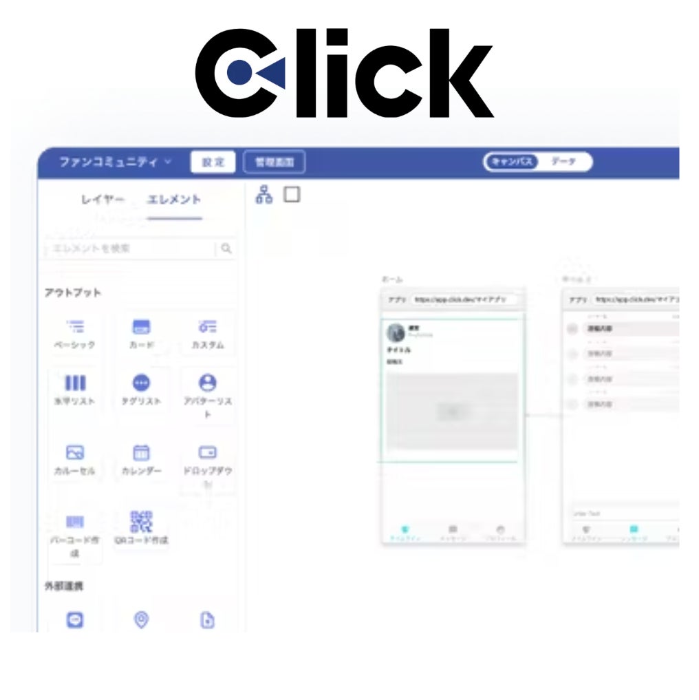 Clickは、プログラミング知識が不要で、iOS、Android、Webアプリを直感的に構築できる、日本発シェアNo.1*のノーコードツールです。プログラミングの専門知識がなくても、短期間でアプリ開発が可能であり、コードを書き換える必要なく作成したアプリ1つでiOS版とAndroid版をリリースできるなど、容易に複数媒体に対応が可能です。直感的に操作できる画面でアプリを制作でき、好きな位置に機能を配置できるなど、カスタマイズ性が高い仕様です。また、外部サービスとのAPI連携やChatGPT連携が可能です。国産ツールであることから、国内基準に準拠した高いセキュリティ性を確保したシステム構築である他、日本のビジネスのニーズにマッチした機能設計となっています。*出典:https://click.dev/