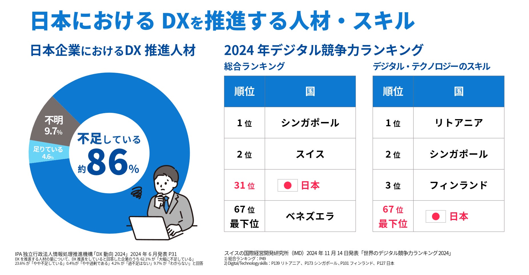 世界中でデジタル化が急速に進む中、日本ではIT人材が2030年に最大で79万人不足する可能性があるという調査結果があり、その内AI技術を活用するデジタル人材は、最大で14.5万人不足すると考えられています。*1 政府等もリスキリングを推進するなど人材育成に力を入れていますが、デジタル人材は依然として不足傾向にあります。2023年度に日本企業を対象に行った調査において、DXに取り組んでいる企業のうち、DXを推進する人材が「不足している」と回答した企業が約86%という結果でした。*2 また、スイスの国際経営開発研究所(IMD)が毎年67カ国におけるデジタル技術の導入と活用を分析・評価し作成している『世界のデジタル競争力ランキング *3』の2024年版で、日本は31位。特に小項目の「デジタル・テクノロジーのスキル」に関しては、67位と最下位という結果でした。デジタル化を迅速に進める上で、推進できる人材を育成・確保していく必要があります。