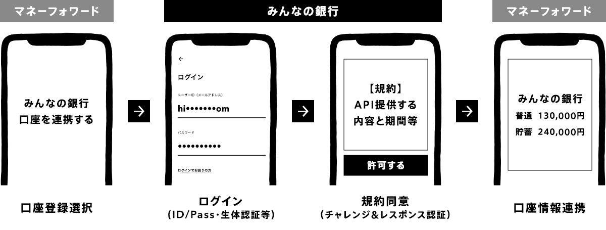 マネーフォワードへ参照系の2種類のAPI(残高照会/入出金明細照会)を提供することにより、今後マネーフォワードが運営する家計簿アプリ「マネーフォワード ME」等のPFM(*2)サービスに、みんなの銀行口座をお持ちのお客さまが残高情報等を連携することが可能となります。