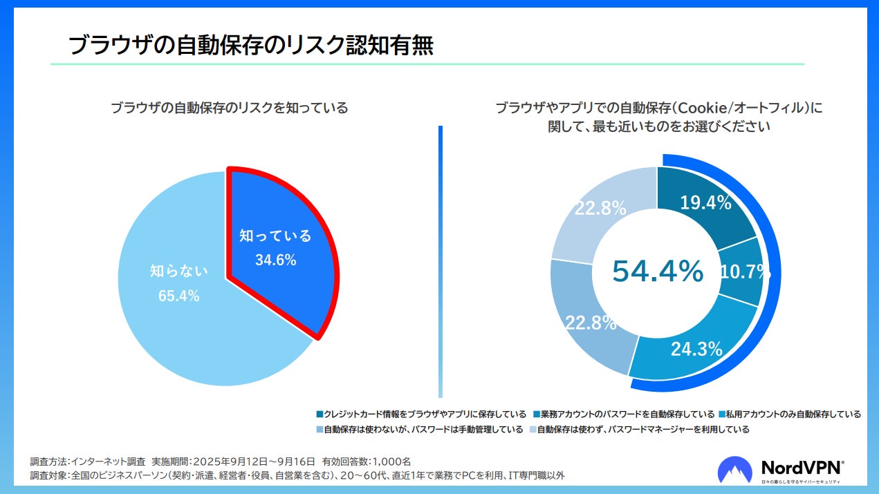 調査の結果、ブラウザやアプリの自動保存機能(Cookie/オートフィル)に潜むリスクを認識している人はわずか34.6%にとどまりました。さらに、リスクを理解しながらも利用している人は54.4%と「2人に1人」が利用していることがわかりました。また、パスワードマネージャーを活用する人は24.1%にとどまりました。