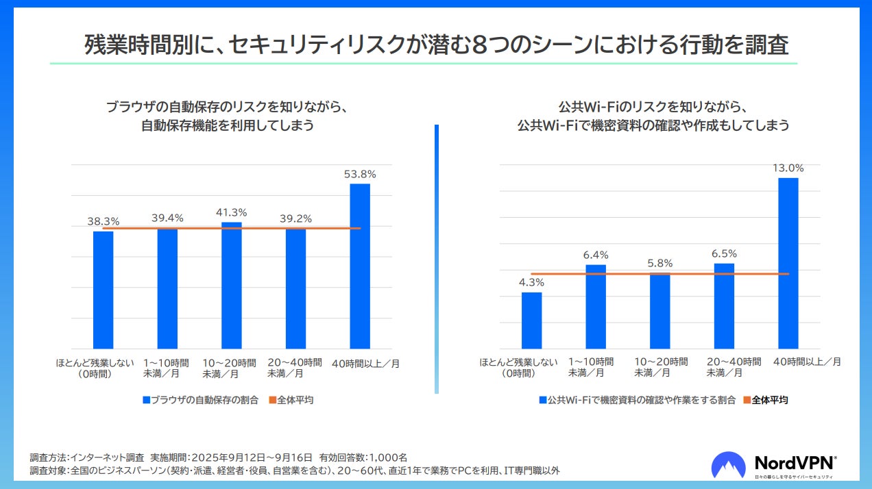 調査の結果、月間40時間以上の残業層は、ブラウザの自動保存利用(53.8%)や個人クラウドへの業務データ保存(42.3%)など、全般的にリスクの高い行動を取る割合が他の層と比べて高い傾向が見られました。中でも、公共Wi-Fiのリスクについて知っていると回答した月間40時間以上の残業層のうち、13.0%が外出先で公共Wi-Fiを利用し、機密資料の確認・作成を行っていることがわかりました。この割合は、全体平均(5.7%)の約2.3倍に達しています。