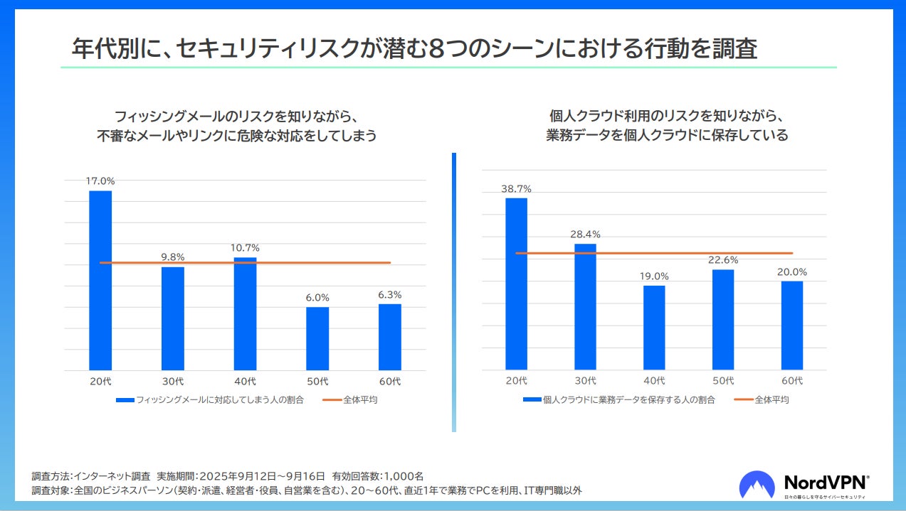 ・年代別では、20代のフィッシングメールによるリスク行動が17.0%と、全体平均(10.2%)の約1.7倍に達し、他世代と比べても突出