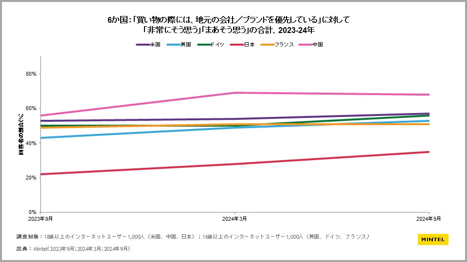 ミンテルの行なった別の消費者調査によると、地元のブランドを優先する比率は2023年から上昇しており、「非常にそう思う」と「まあそう思う」の合計の比率で、主要国6か国中、日本を除く5か国で50%を超えています。日本でも数値は増加しており、2024年9月には35%に達しています。