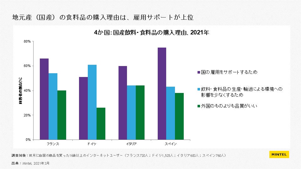ヨーロッパ4か国での消費者調査で、国産の飲料・食品の購入理由を聞いた質問では、「国の雇用をサポートする」が4か国すべてで50%を超え、フランス・イタリア・スペインでは、1位となっています。