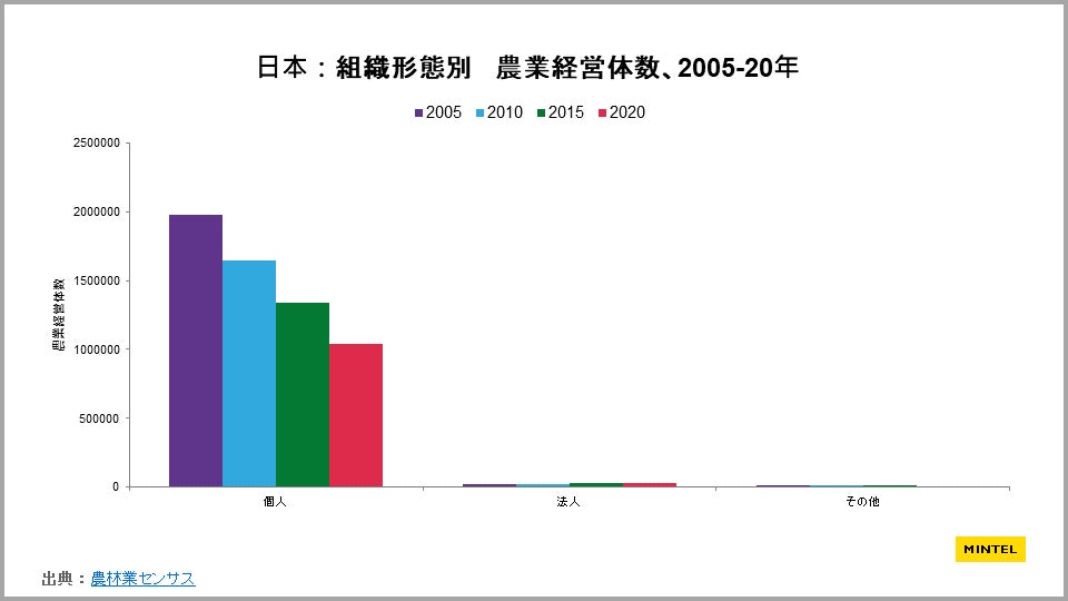 さらに日本の農業人口を経営体数別にみると、個人経営体が大きく減少しており、2020年は約100万経営体と2005年の52%まで減少しています。一方、法人化されている法人経営体は増加しており、2020年の2005年比は161%となっています。法人が増えて効率化はやや進んでいると思われますが、個人経営体の大幅な減少は、日本の食料自給力に影響を与えており、高齢化が今後進んでいくことも考えると、日本の農業の将来が懸念されます。