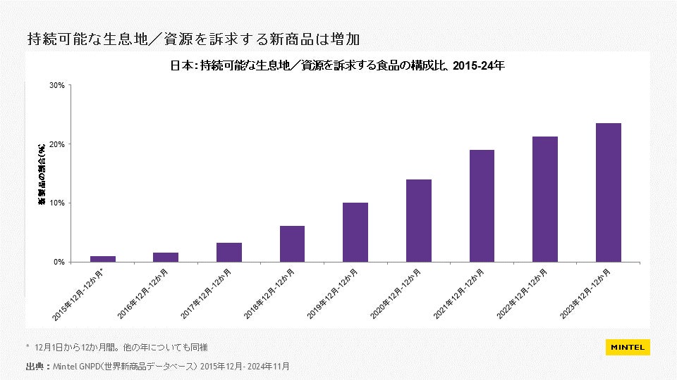 一方でブランド側の地産地消への対応もより多面化しつつあります。日本における新商品で、「持続可能な生息地/資源」を訴求する商品の構成比は急速な伸びを見せており、2024年には2020年の2倍を超えるレベルになっています。