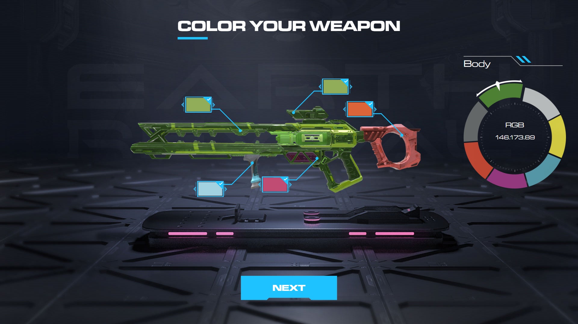 専用の端末にて、ゲームに登場予定の一部の武器をご覧いただけます。さらに、マズル、ストック、グリップ部分の部品や色をカスタムして自分だけの組み合わせを作成できます。作成した武器は、モニター上でスライドショー形式に展示予定です。