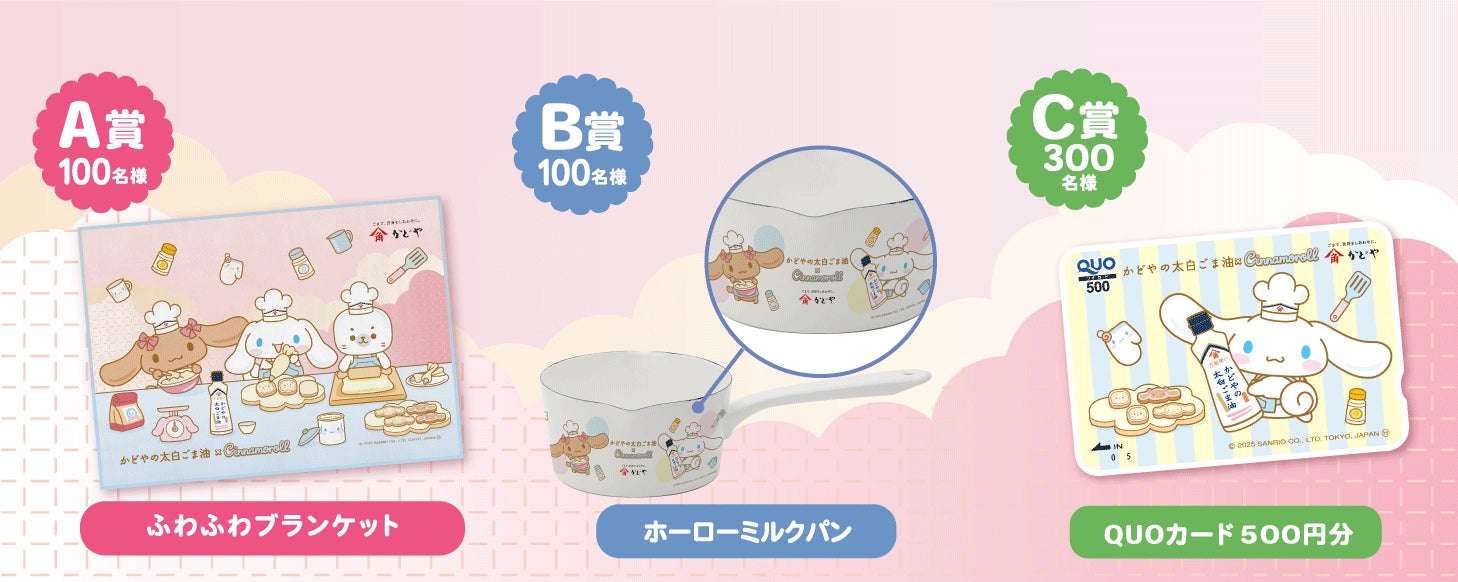 かどやの太白ごま油を購入し、応募いただくと抽選で500名様にシナモロールとコラボしたオリジナルグッズをプレゼント。寒い日に嬉しいブランケットやお菓子作りに使えるホーローミルクパン、QUOカードが当たります。