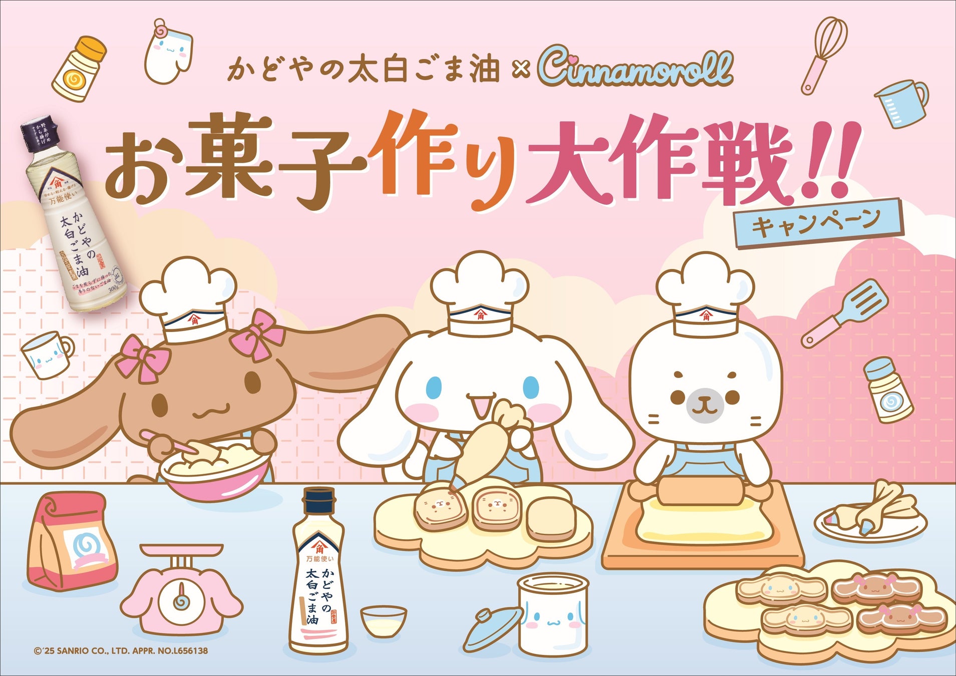 1858年に小豆島で創業し、165年以上にわたって“ごま”を通じてお客様に健康と笑顔をお届けするかどや製油株式会社(所在地:東京都品川区、代表取締役社長:久米敦司)は、2024年サンリオキャラクター大賞で1位を獲得した、株式会社サンリオの大人気キャラクター「シナモロール」とコラボし、2025年1月10日(金)から「かどやの太白ごま油×シナモロール お菓子作り大作戦!!キャンペーン」を実施いたします。(https://www.kadoya.com/campaign-cinnamoroll2025/)