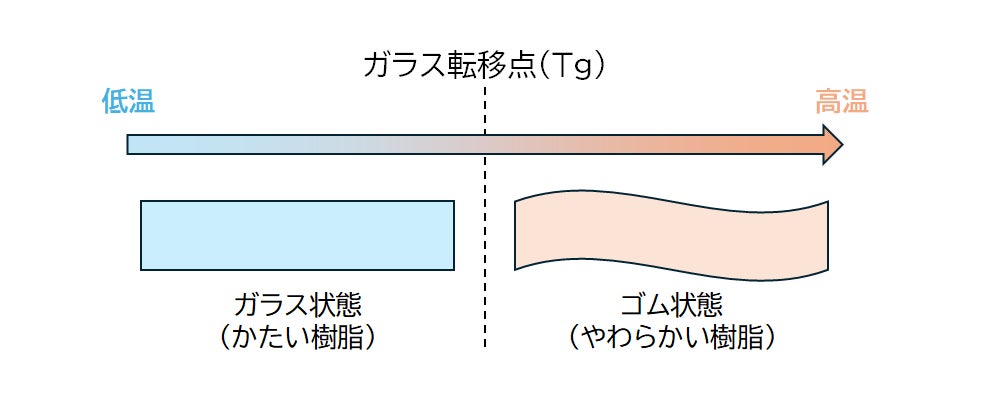 分子の動きが制限された硬質のガラス状態と、分子が運動しやすい軟質のゴム状態の境目の温度のこと。一般的にはTg以下の温度ではガラス状態、Tg以上の温度ではゴム状態を示す。