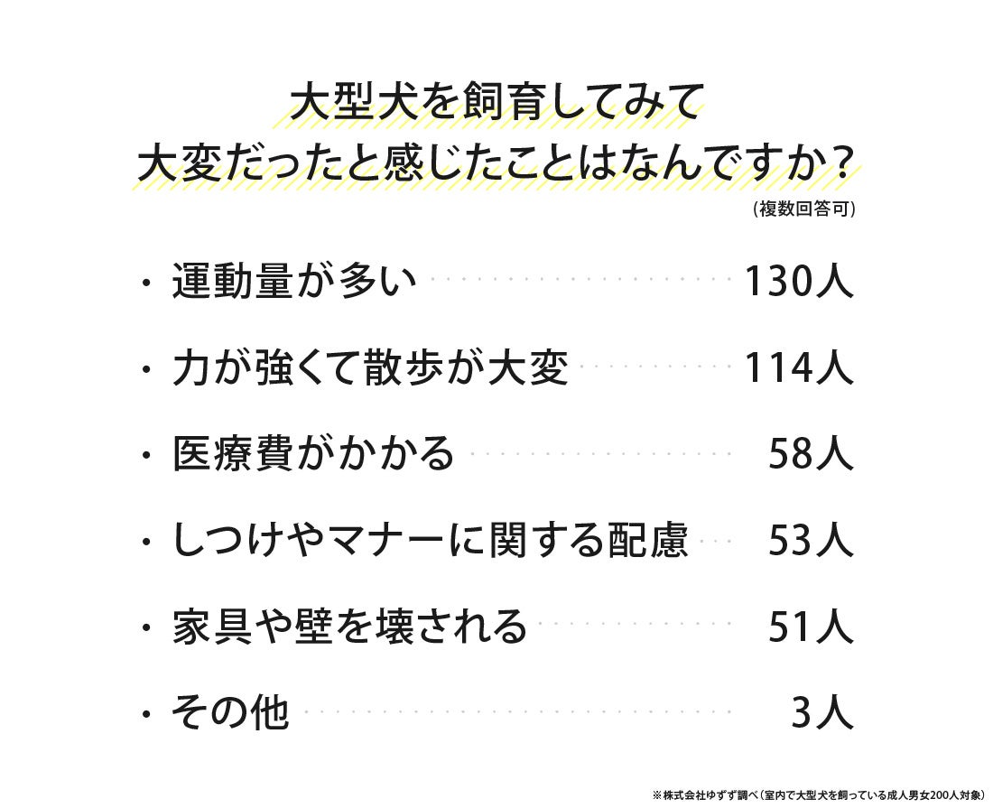「大型犬を飼育してみて大変だったと感じたこと(複数回答可)」では、「運動量が多い」130人が最多、次いで「力が強くて散歩が大変」114人となりました。