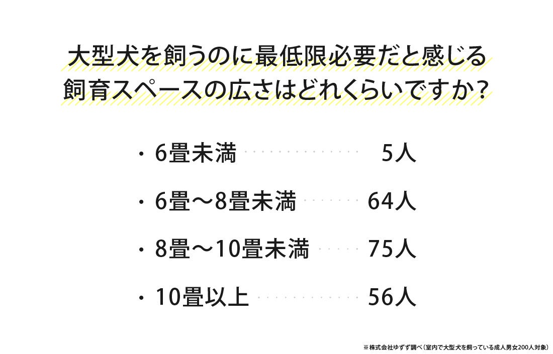 「大型犬を飼うのに最低限必要だと感じる飼育スペース」については、「8畳〜10畳未満」75人が最多となりました。