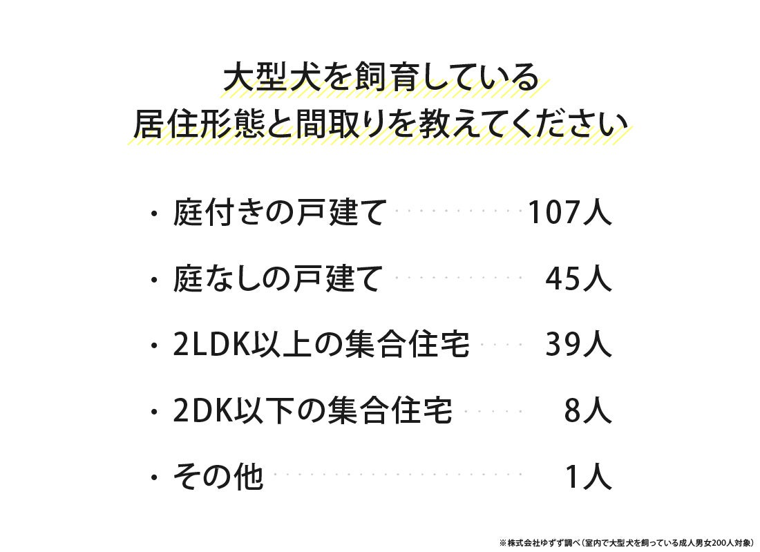 室内で大型犬を飼育している飼い主200人に「居住形態と間取り」について尋ねたところ、「庭付きの戸建て」107人が最多でした。