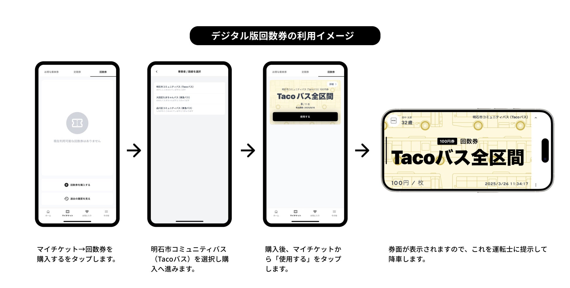 二次交通のDXを推進するRYDE株式会社(本社:東京都渋谷区、代表取締役 杉崎正哉、以下「RYDE」)は、明石市のコミュニティバス「Tacoバス」のデジタル版回数券を、RYDEが提供するモビリティプラットフォーム「RYDE PASS」上で2025年4月1日より販売開始いたします。