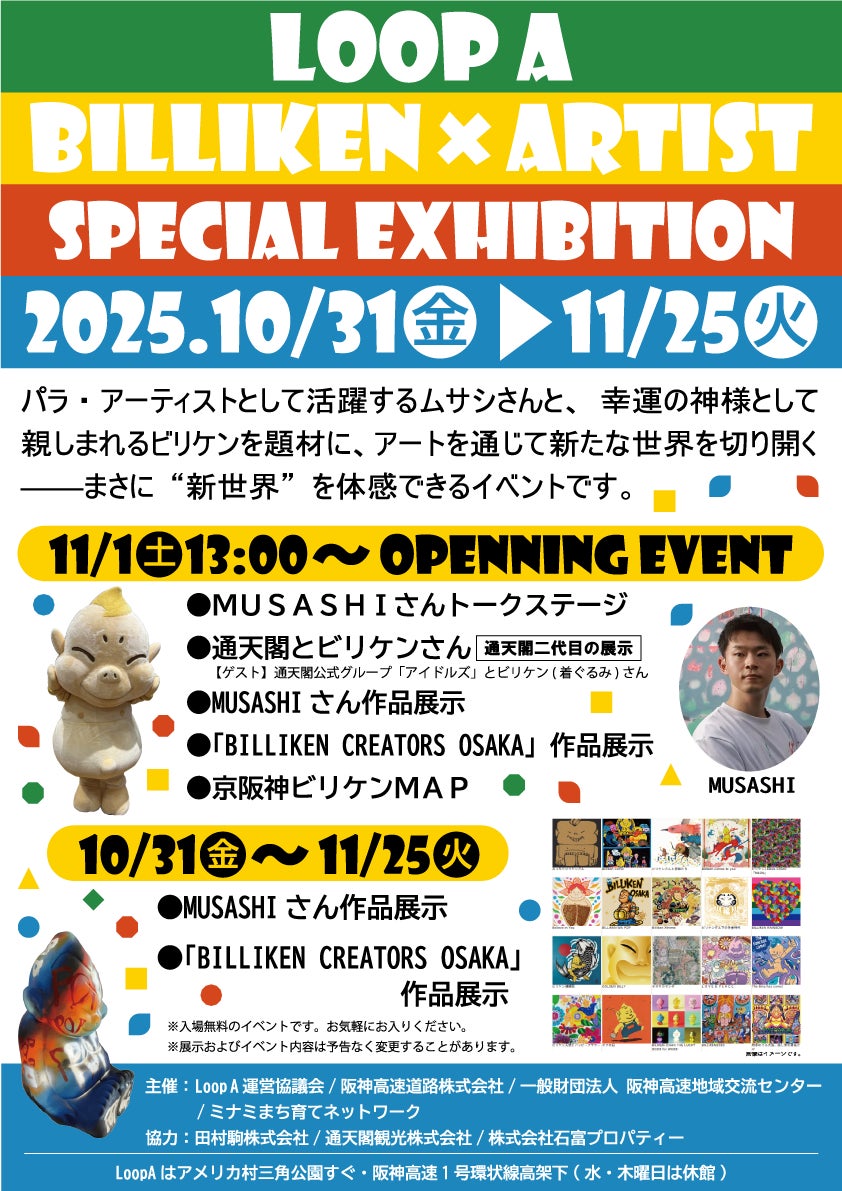 「ビリケンさん」のライセンス事業を展開する田村駒株式会社(所在地:大阪府大阪市、代表者:堀 清人)は、2025年10月31日(金)から11月25日(火)までの期間、阪神高速ミナミ交流プラザ「Loop A」にてLoop A「BILLIKEN × Artist」企画展を開催することをお知らせいたします。