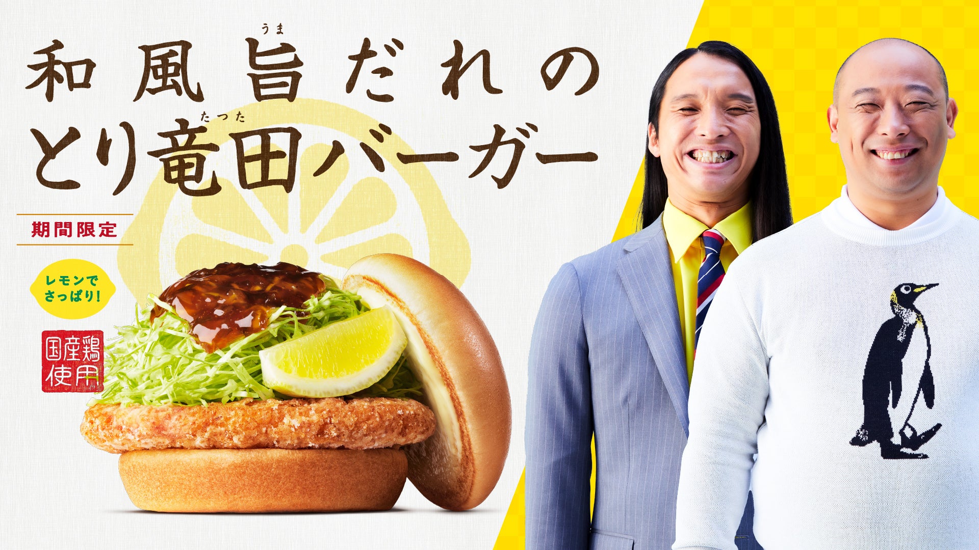 今回は、新商品のポイントでもある『とり竜田とレモンが合体!』(とり竜田に生レモンを添えたバーガー)という点に着目して、『合体ネタ』の名手でもあり、今とてもホットな“トム・ブラウン”さんの起用が決定しました。WEB動画では、新商品の特長である、味の変化を楽しむ「生レモン」とボリューミーな『とり竜田』の合体という要素を、“トム・ブラウン”さんが『合体漫才』として披露しています。27日(木)には、『合体漫才』を更にカオスにした『超合体漫才』動画の公開も予定しています。