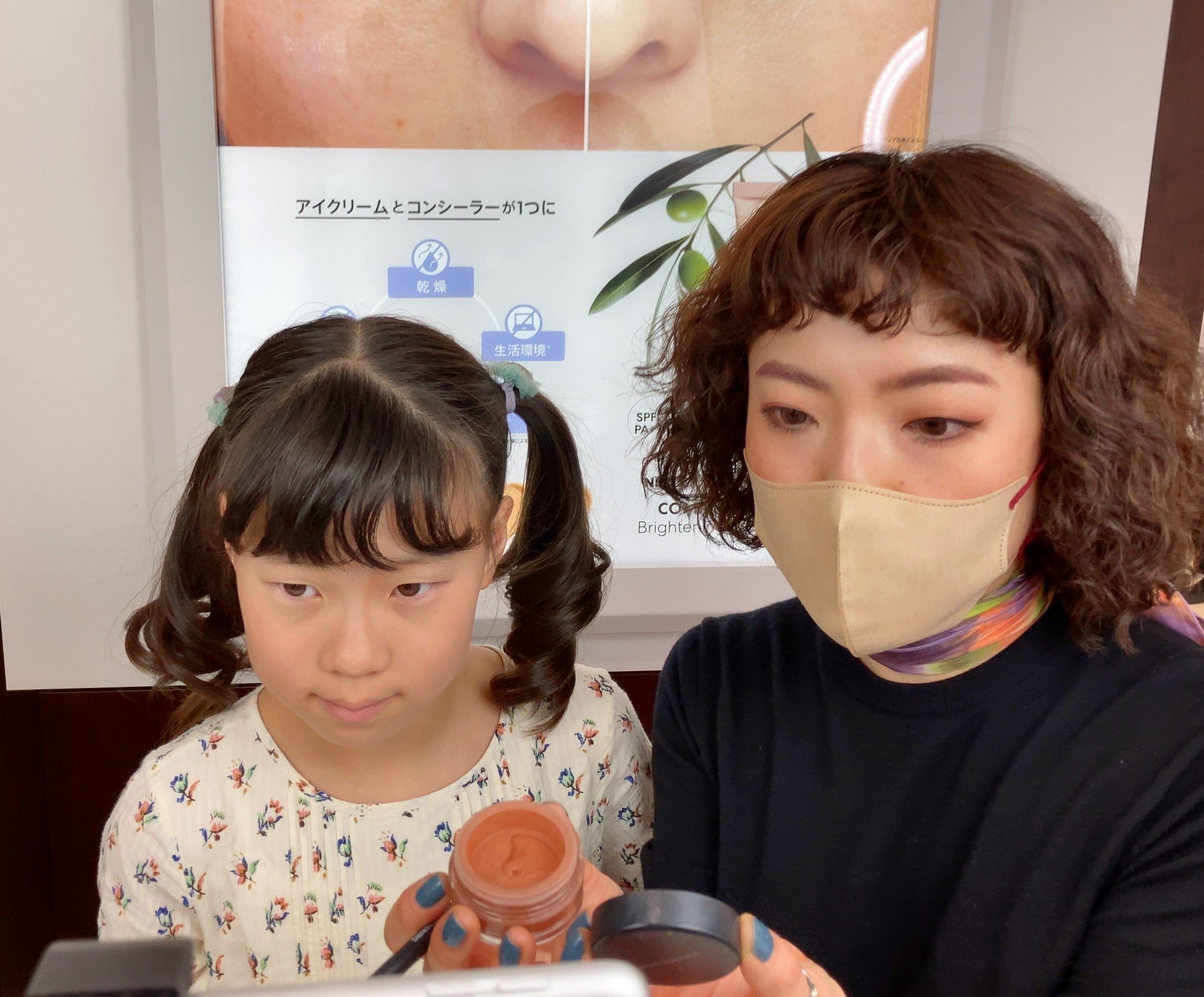 粉に指で圧をかけると、クリーミーに変化するという説明では、子供たちみんなが興味深く、自分たちの指で粉の変化を見たり、手や顔に塗る姿が見られました。バレエの発表会でいつもかゆみを感じ香花(カハナ)ちゃんでも、不快さがなくファンデーションをのせることができました。