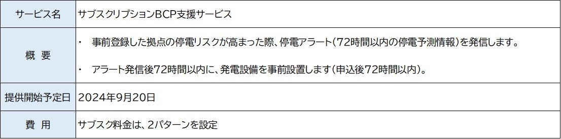 本サービスでは、あらかじめ登録した拠点の停電リスクが高まった際、停電アラートを発信し、発電設備を事前設置します。対象は主に企業や自治体で、サブスク型(月額制)でサービス提供します。