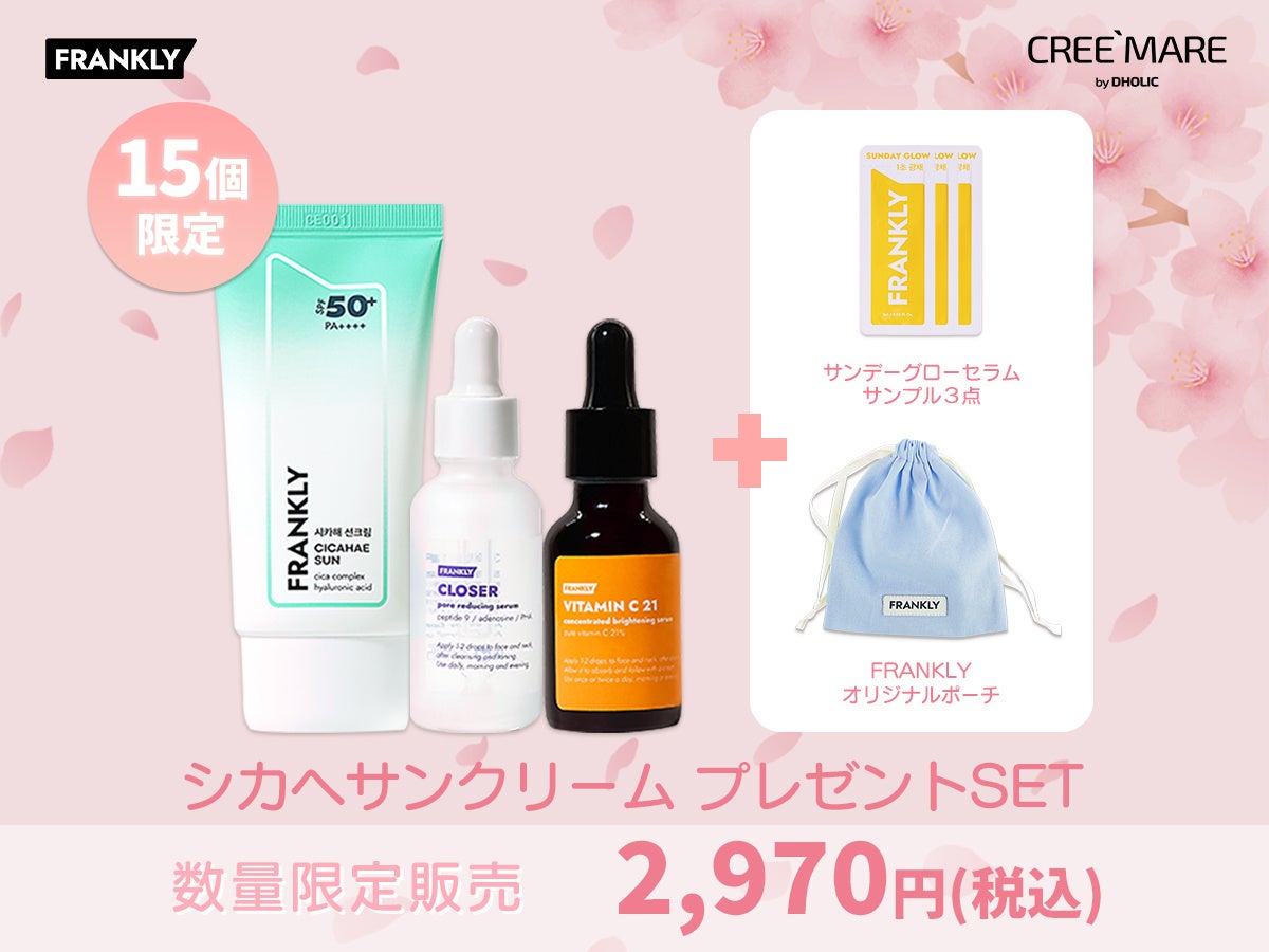 株式会社シンビジャパン(代表取締役 沈 載哲 シム ゼチョル)は韓国スキンケアブランドFRANKLY (フランクリー)の期間限定店頭プロモーションをCREE`MARE by DHOLICで開催いたします。新生活を迎える皆さまに肌の透明感と毛穴の引き締めをWでサポートするオリジナルセットをご用意いたしました。こちらのセットは2種、店頭販売のみ数量限定として展開します。