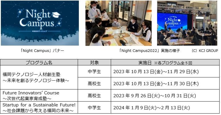 KCJ GROUPが「キッザニア福岡」にて、2022年より平日夜のキッザニアに学校の枠を超えて中・高校生および大学生が集い学び合う、新しい生きる力伸長の場を提供しているワークショップです。過去のプログラム:https://www.kidzania.jp/corporate/common/pdf/220906_nightcampus.pdf