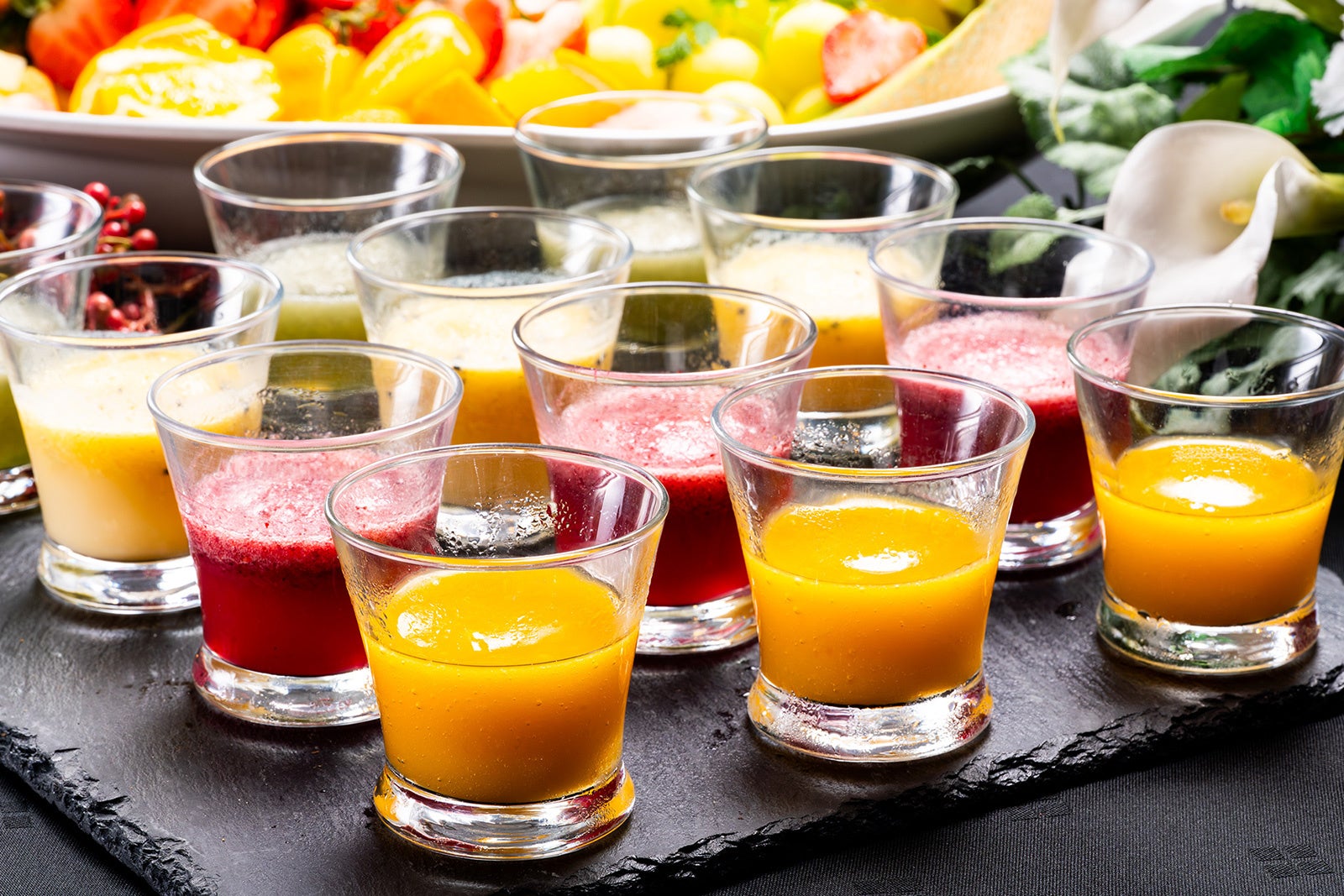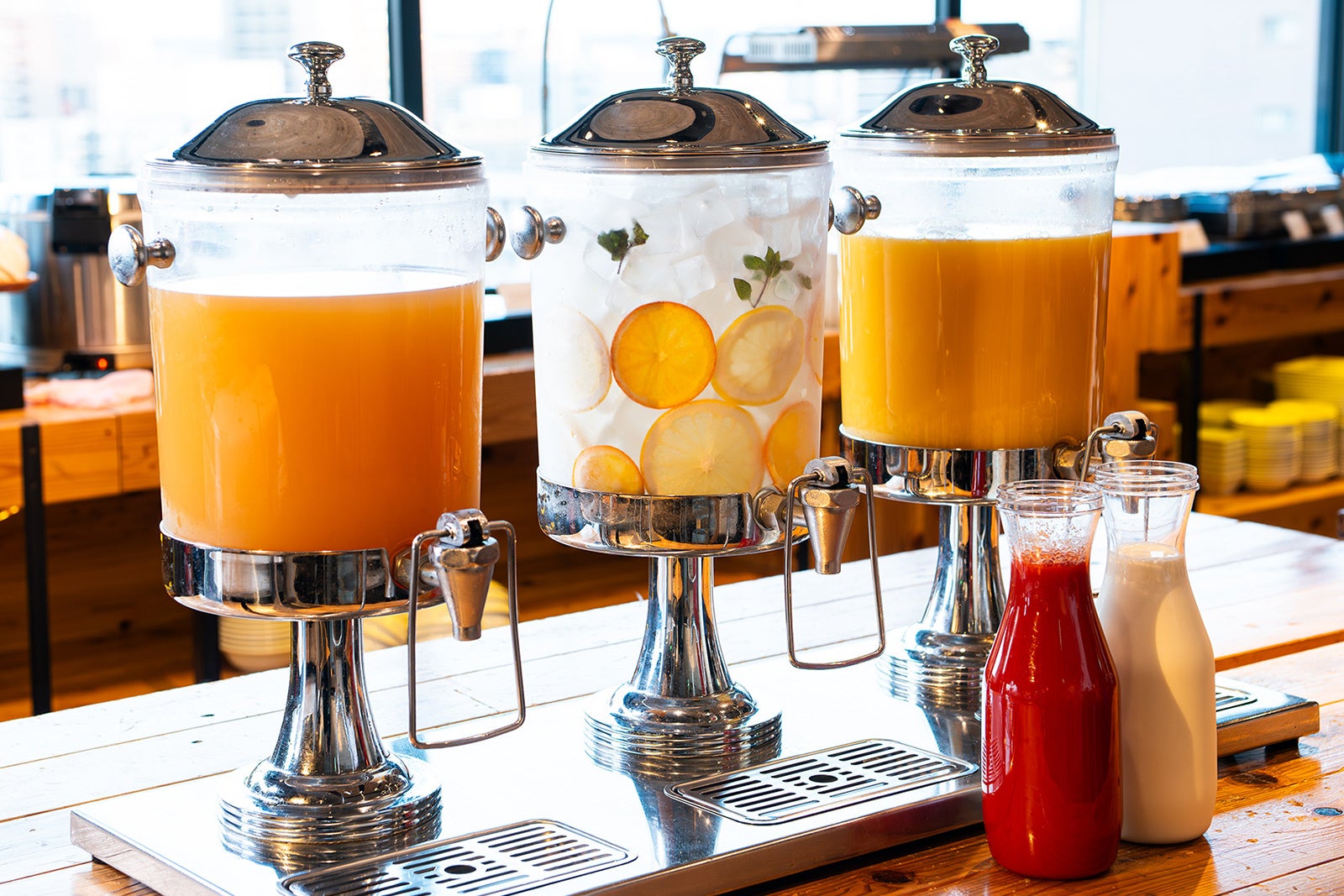 食事に合わせて楽しめるドリンクコーナーも一新しました。栄養たっぷりの4種類のスムージーをはじめ、トマトジュースやデトックスウォーターなど体にやさしいラインアップに加え、朝から贅沢に楽しめるスパークリングワインもご用意。健康志向の方はもちろん、特別な朝のひとときを味わいたい方にも満足いただける、ホテルならではの多彩で華やかなモーニングドリンクをお楽しみいただけます。