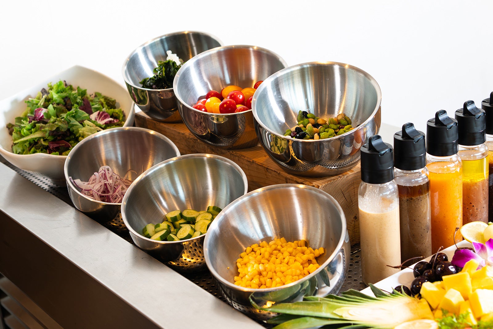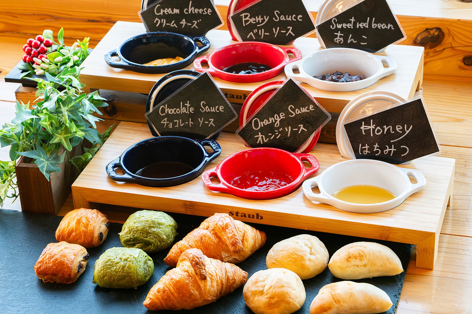 朝の香りを引き立てる焼き立てパンは、クロワッサンやデニッシュなど定番のほか、日替わりで、はちみつ豆乳パン、ミルクパン、プチブランなど多彩な種類をご用意。パンに合わせて楽しめるスプレッドも豊富で、バターやジャムのほか、チョコレートスプレッドや季節限定フレーバーなど、気分に合わせた組み合わせをお楽しみいただけます。さらに、シャキッと新鮮なサラダコーナーや、種類豊富なドレッシング、みずみずしい季節のフルーツもラインアップ。50種類以上のメニューが並ぶ朝食ブッフェは、和洋中さまざまな味わいを少しずつ楽しみながら、自由に組み合わせて、自分だけの朝食体験をご堪能いただけます。