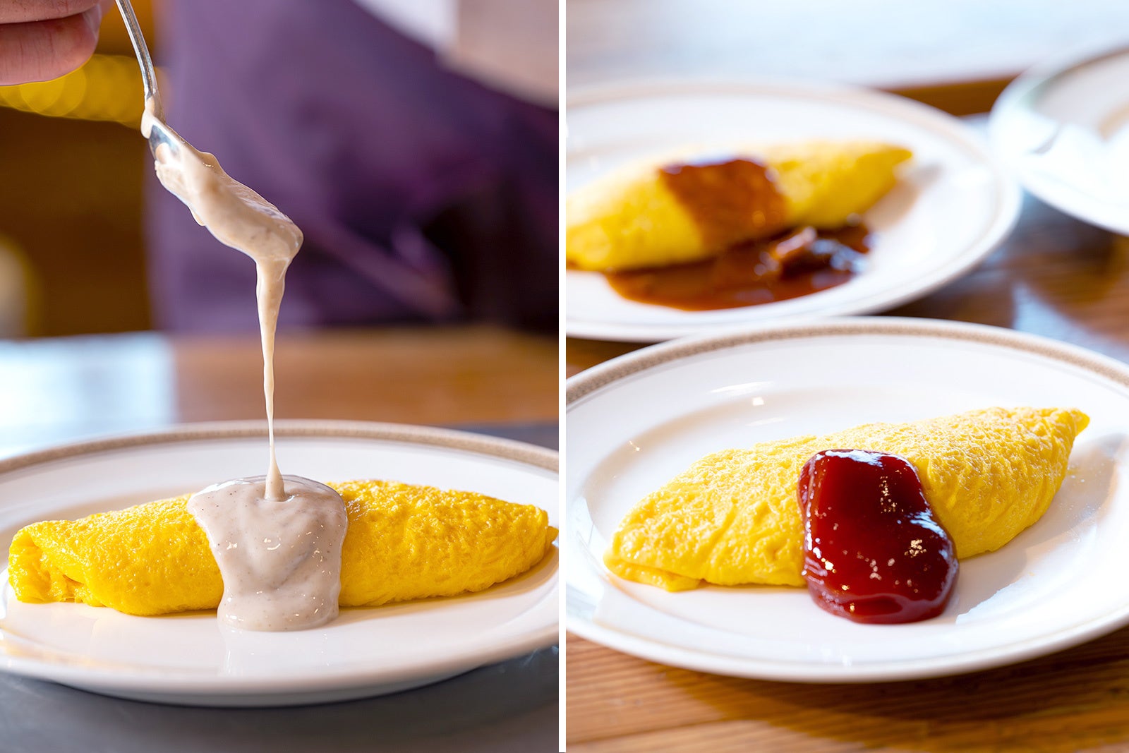 シェフが目の前で一つひとつ丁寧に焼き上げる、ふわとろ食感のオムレツ。トマト、デミグラス、クリームの定番ソースのほか、季節の食材を使った限定ソースも登場します。湯気とともに立ちのぼる香りや、できたてならではのやさしい口当たりを、ライブキッチンの臨場感とともにお楽しみください。