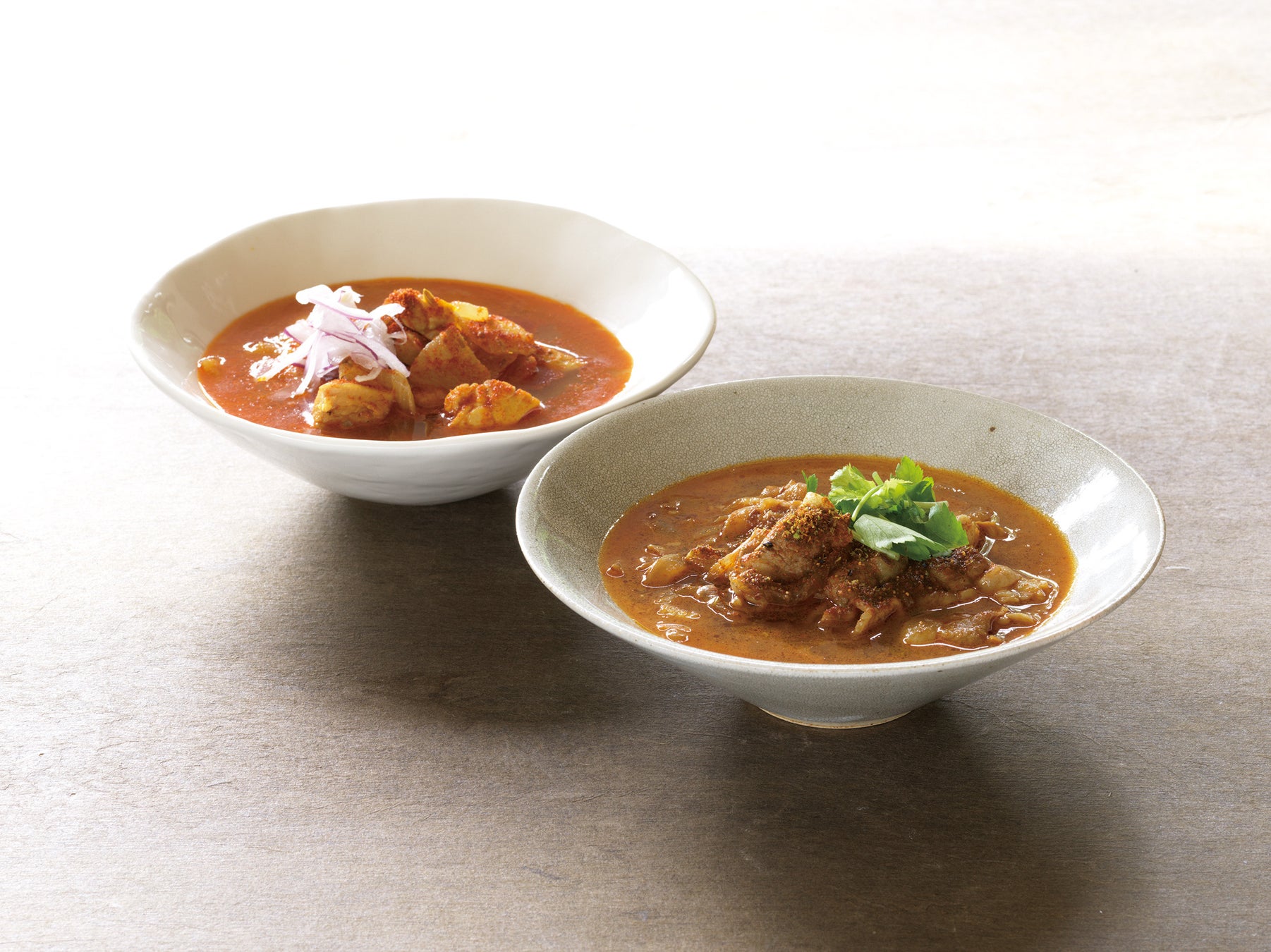 茅乃舎だしを使った和風味には、生姜やクローブなど香り豊かなスパイスを。野菜だしを使った洋風味にはカルダモンやフェンネルなど華やかなスパイスをはじめとして、それぞれ約10種類のスパイスを使用。スパイスの個性とだしの調和を大切に、食欲が落ちがちな夏にも食べやすい、辛味に頼らない深くて巧妙なカレーに仕上げました。