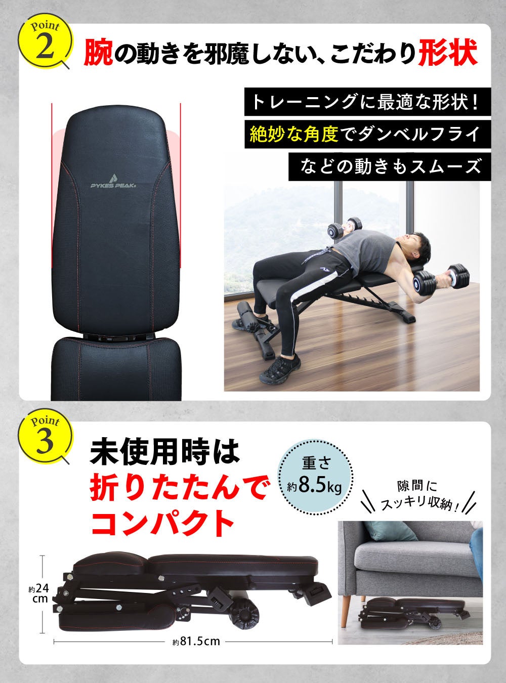 PYKES PEAKのトレーニングベンチは、一秒で角度調整可能!バックシート8段階、シートクッション4段階、レッグホルダー3段階!コンパクトなデザイン設計ながら、鍛えたい部位やメニューに合わせて自由に変更することができます。