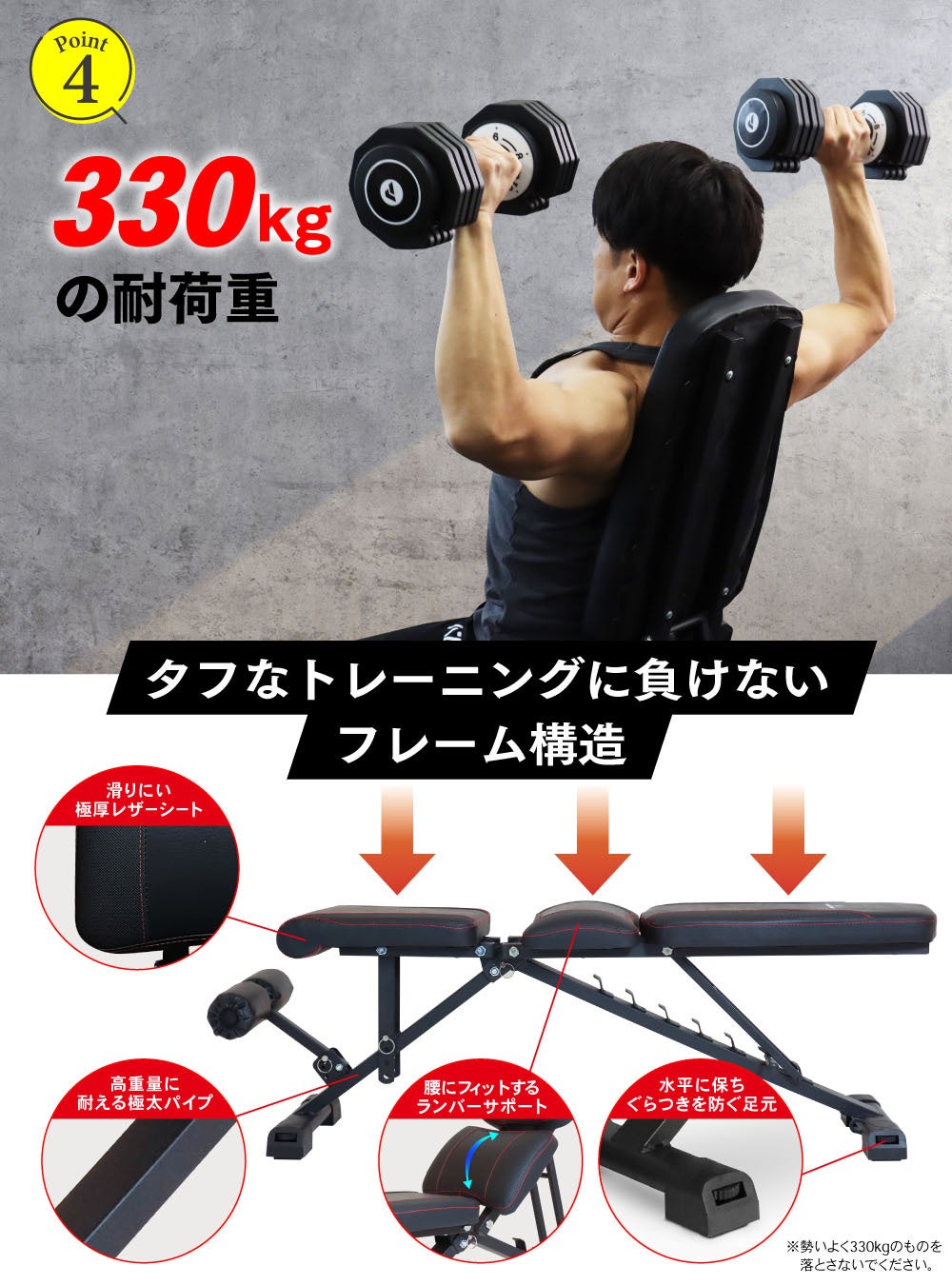 耐荷重330kg※且つ安定感を高めるための衝撃吸収ヘッドや高重量に耐えられる極太パイプを採用することで荷重に強いフレーム構造を実現しました。また、トレーニング後は半分に折り畳んでベッド下や押入れに収納できるので、場所を取る心配もありません。※体重110kg以内、使用するトレーニング器具150kg以内でご使用ください。