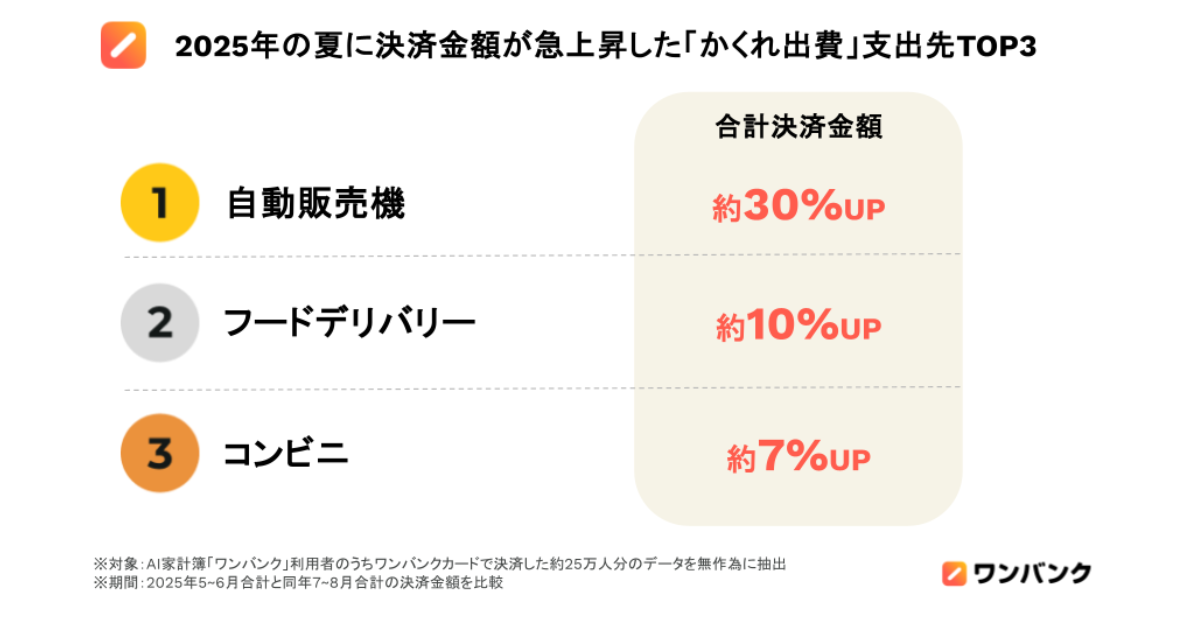 今年の夏に合計決済金額が増加した「かくれ出費」の支出先1位は「自動販売機」!夏が始まる前と比べて約30%も増加しました。以降は2位「フードデリバリー」約10%増、3位「コンビニ」約7%増と続きました(*1)。