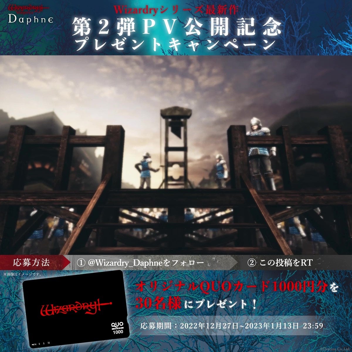 『Wizardry Variants Daphne』公式Twitterアカウント(@Wizardry_Daphne)にて、抽選で30名様にオリジナルQUOカード1,000円分が当たる「フォロー&リツイートキャンペーン」を実施します。