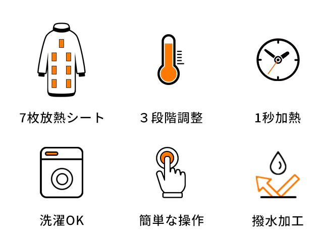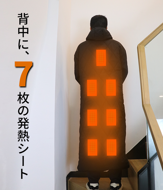 ボタンを押すだけで、1秒間で発熱を開始、7枚の発熱シート約10秒間で全身をぽかぽかに。