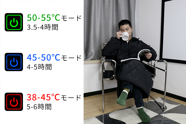また、使い方も簡単で、モバイルバッテリーに接続してボタンを押すたびに、加熱レベルが3段階で変わります。