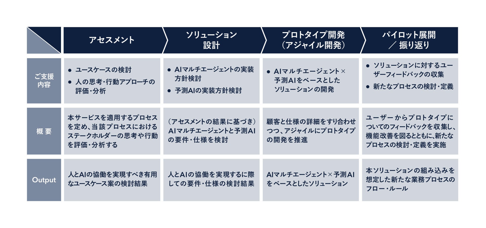 本サービスでは、生成AIなどのテクノロジーに精通しているコンサルタントや、データサイエンティストが、ビジネスプロセスのアセスメントからソリューションの開発と展開までEnd to Endで支援します。まず、アセスメントフェーズでクライアントの課題を評価・分析し、ビジネスとテクノロジーの両面から解決のアプローチを検討します。その結果に基づき、AIマルチエージェントと予測AIの組み合わせを用いたソリューションを設計し、アジャイル開発を行います。そして、AIマルチエージェントと予測AIを活用した新たなビジネスプロセスの検討と定義を行います。