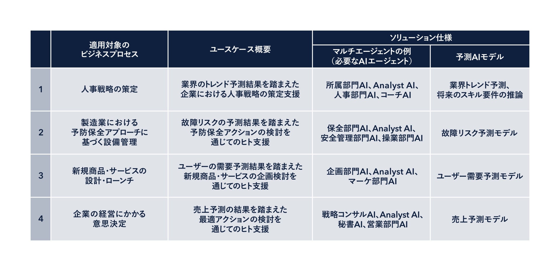 本サービスの具体的なユースケースとしては、人事戦略の策定や、製造業における予防保全アクションの検討、新商品やサービスの設計、企業経営にかかる意思決定プロセスに関するケースなどを想定しています。各ユースケースにおいて、多数のステークホルダーとの調整を踏まえてアクションプランを検討する必要があったり、人の経験と勘を頼りに遂行していたりしたプロセスにおける多くのタスクをAIに代替させていきます。