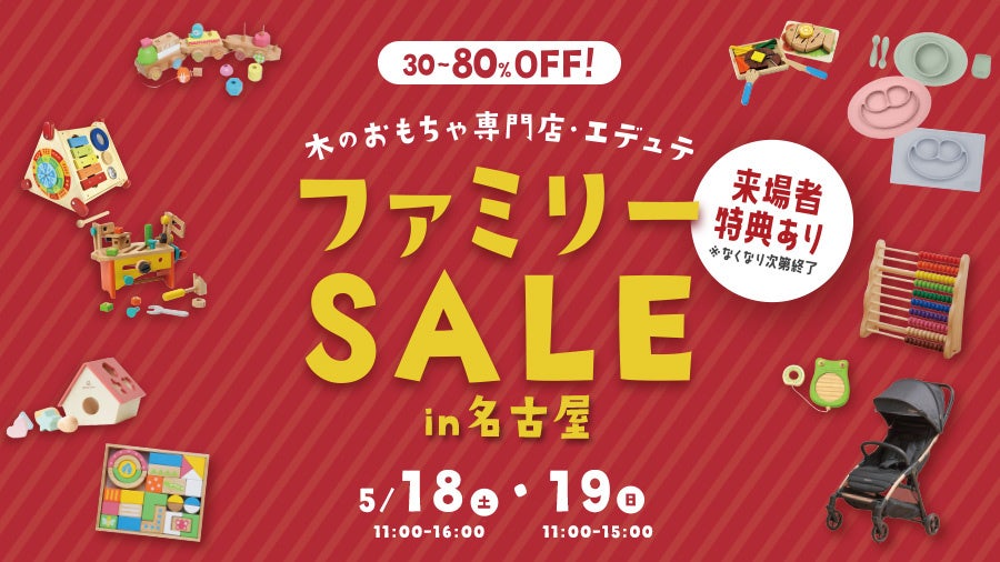 エデュテ株式会社(代表取締役社長:中尾信也)は、2024年5月18日(土)~5月19日(日)の期間、名古屋市大須にあるレンタルスペース エトセトラにて「エデュテファミリーセール2024夏」を開催いたします。人気の木製玩具が2日間限定の最大80%OFFでお買い求めいただけます。