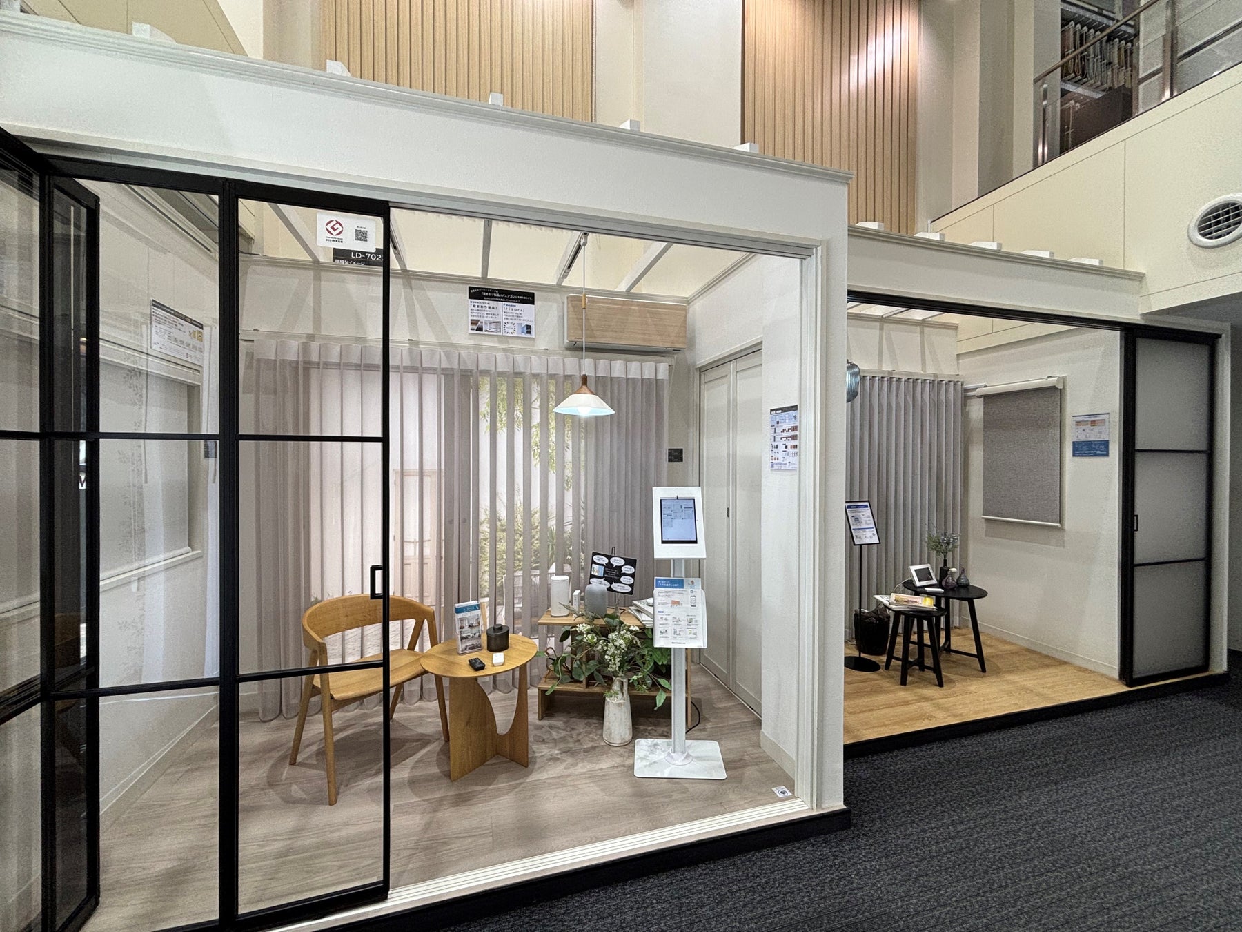 ショールームでは、ブラインドや間仕切りの展示に加え、家具や小物を用いたインテリアコーディネートをご提案しています。窓辺のカラーコーディネートから、お客様のライフスタイルに合わせた空間づくりまで、幅広くサポートいたします。
