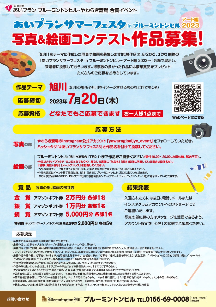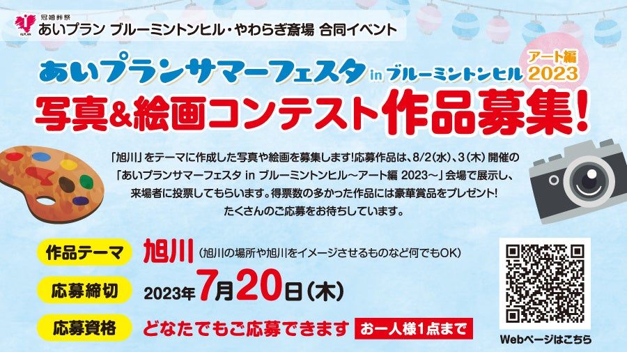 8月2日(水)3日(木)に旭川のブルーミントンヒルで『あいプランサマーフェスタ in ブルーミントンヒル』を開催いたします。イベントの一つとして、本年は写真&絵画コンテストを行います。写真と絵画の2部門で行い、『旭川』をテーマにした作品を募集します。
