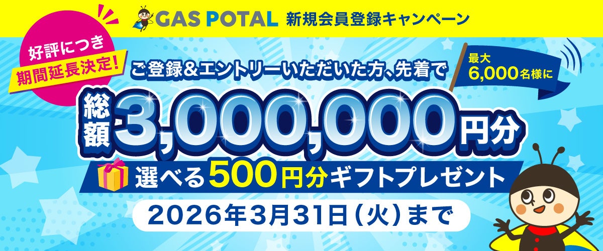 株式会社クラブネッツ(本社:東京都渋谷区、代表取締役社長:芦名 真也)は、2025年12月にリリースしたガス業界特化型ポータルサイト『GAS POTAL(ガスポタル)』(https://gaspotal.jp/)において、現在実施中の「新規会員登録キャンペーン」を好評につき2026年3月31日(火)まで期間延長することをお知らせいたします。