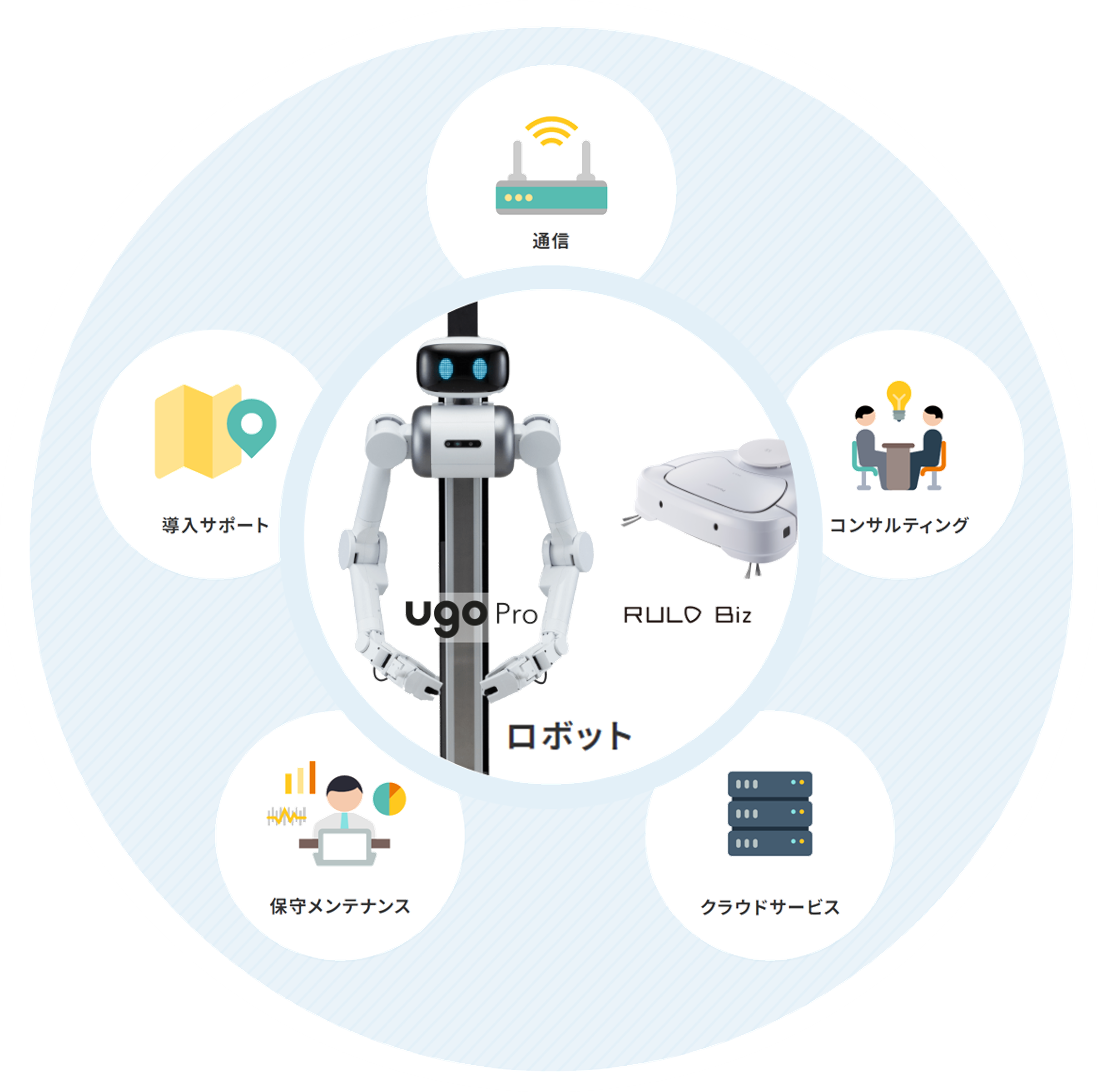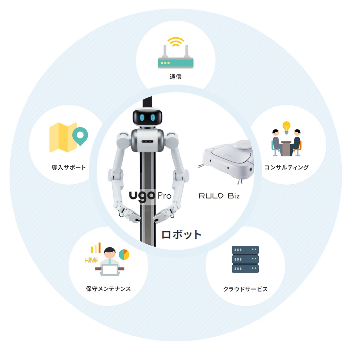 清掃技能No.1※2のテルウェル西日本と警備ロボット販売数No.1※3のugoによる、清掃ロボット・警備ロボット、通信サービス、導入サポート、保守サービス等をワンストップで月額定額制料金※4にて提供します。