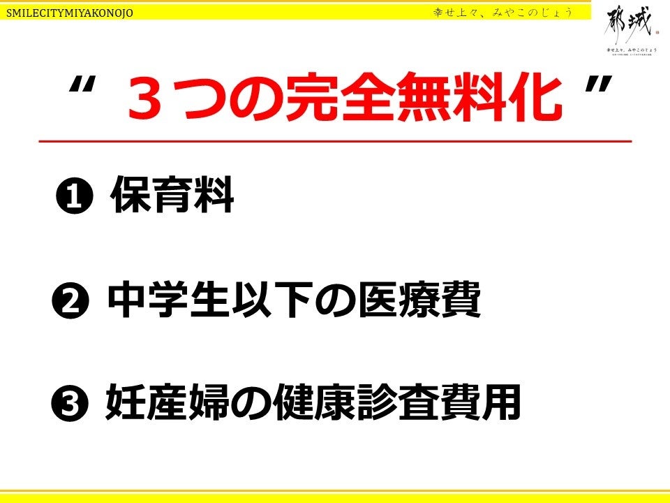 ○自然増対策として、保育料・中学生以下の医療費・妊産婦の健康診査費用の『3つの完全無料化』の実現!