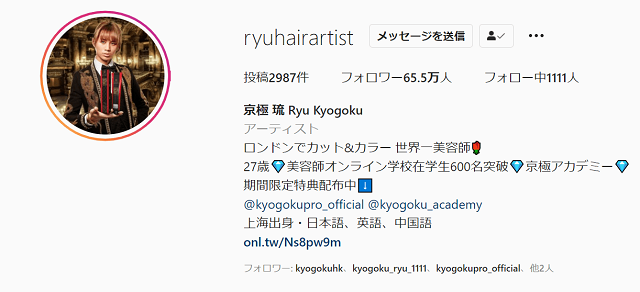 現在Instagramのフォロワーは65万人を超えており、美容師問わずファンも多い京極琉の日常は、SNSでもラグジュアリーな日常を公開しています。