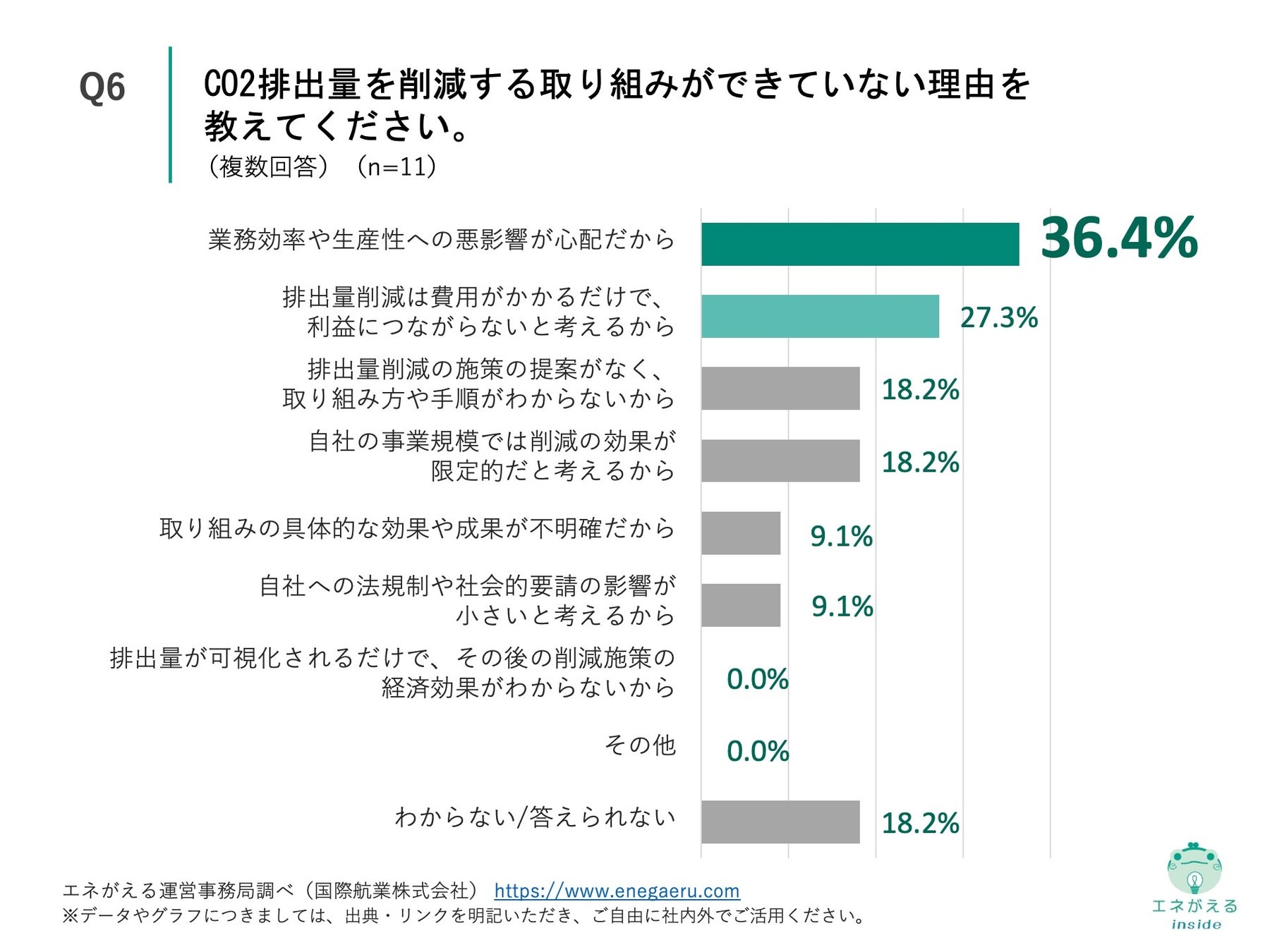 Q4で「実施しておらず、検討もしていない」と回答した方に、「Q6.CO2排出量を削減する取り組みができていない理由を教えてください。(複数回答)」(n=11)と質問したところ、「業務効率や生産性への悪影響が心配だから」が36.4%、「排出量削減は費用がかかるだけで、利益につながらないと考えるから」が27.3%という回答になりました。